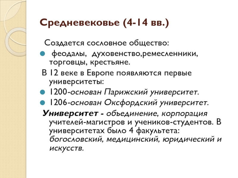 Университет - объединение, корпорация учителей-магистров и учеников-студентов. В университетах было 4 факультета: богословский, медицинский, юридический и искусств.