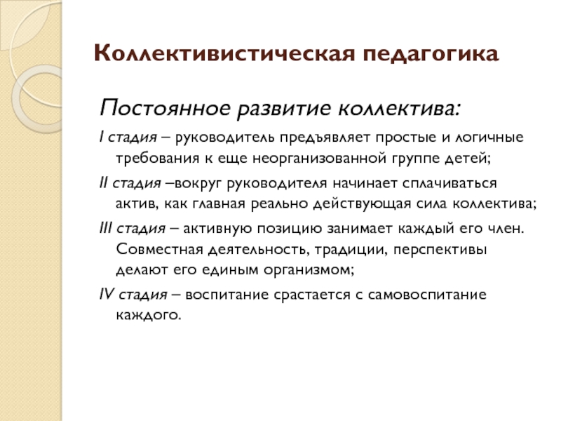 III стадия – активную позицию занимает каждый его член. Совместная деятельность, традиции, перспективы делают его единым организмом;
