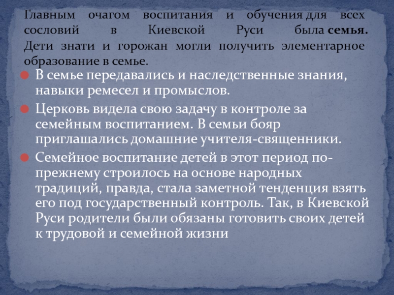 Главным очагом воспитания и обучения для всех сословий в Киевской Руси была семья.