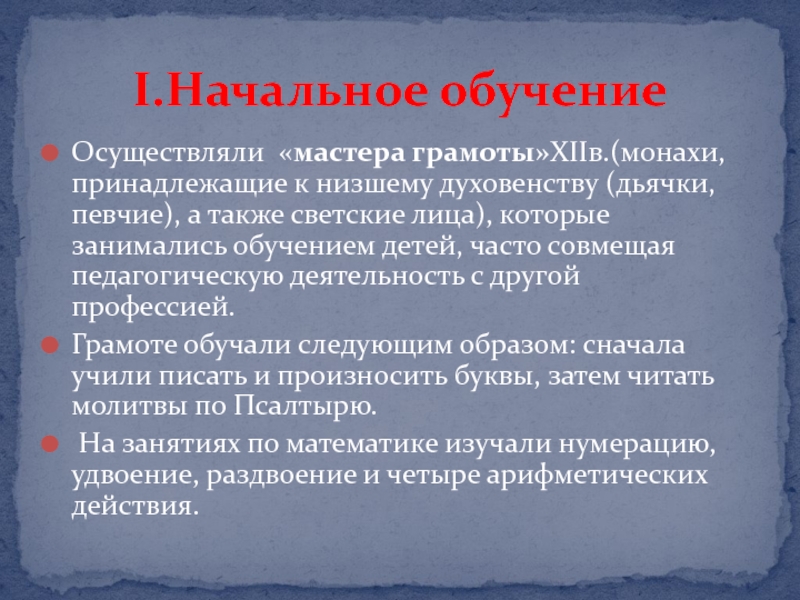 Слайд 8Осуществляли «мастера грамоты»XIIв.(монахи, принадлежащие к низшему духовенству (дьячки, певчие), а