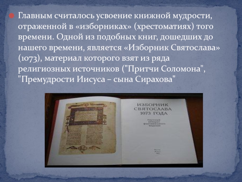 Слайд 17Главным считалось усвоение книжной мудрости, отраженной в «изборниках» (хрестоматиях) того