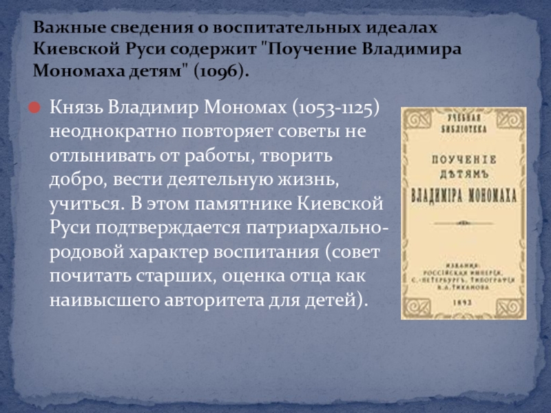 Важные сведения о воспитательных идеалах Киевской Руси содержит "Поучение Владимира Мономаха детям" (1096).