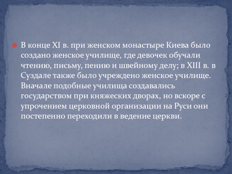 делу; в XIII в. в Суздале также было учреждено женское училище. Вначале подобные училища создавались государством при княжеских дворах, но вскоре с упрочением церковной организации на Руси они постепенно переходили в ведение церкви.