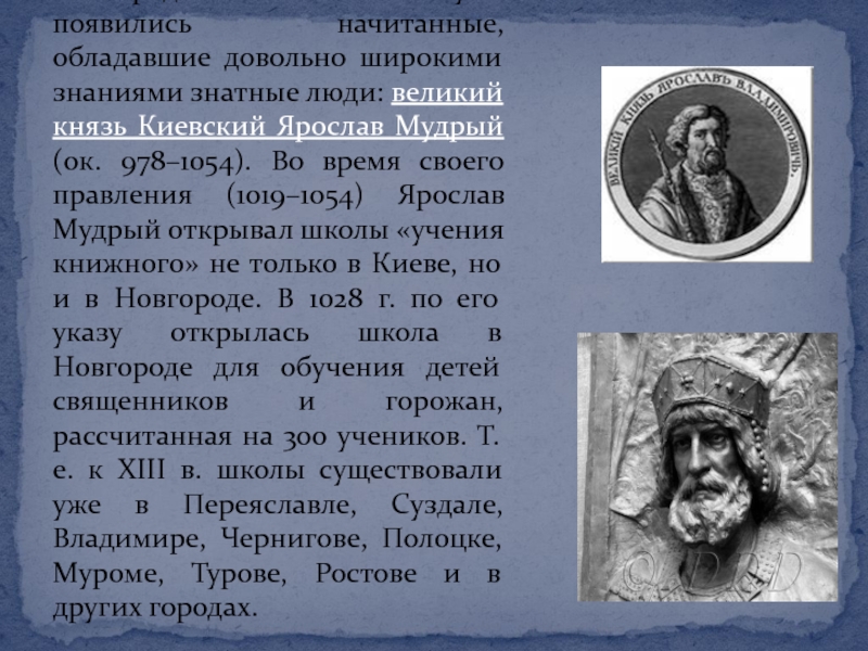 (ок. 978–1054). Во время своего правления (1019–1054) Ярослав Мудрый открывал школы «учения книжного» не только в Киеве, но и в Новгороде. В 1028 г. по его указу открылась школа в Новгороде для обучения детей священников и горожан, рассчитанная на 300 учеников. Т.е. к XIII в. школы существовали уже в Переяславле, Суздале, Владимире, Чернигове, Полоцке, Муроме, Турове, Ростове и в других городах.