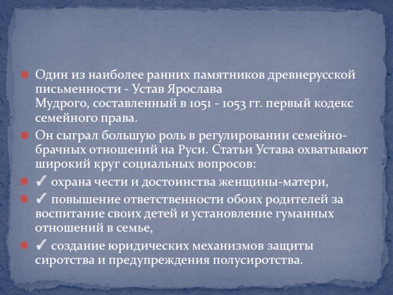 Слайд 22Один из наиболее ранних памятников древнерусской письменности - Устав Ярослава Мудрого, составленный