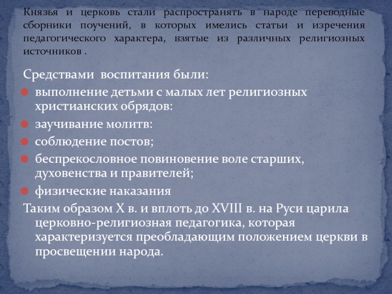 X в. и вплоть до XVIII в. на Руси царила церковно-религиозная педагогика, которая характеризуется преобладающим положением церкви в просвещении народа.