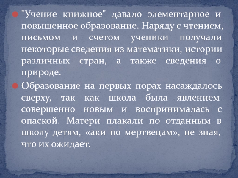 Слайд 10"Учение книжное" давало элементарное и повышенное образование. Наряду с чтением,