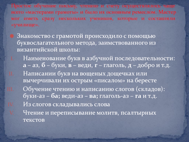 Слайд 13Знакомство с грамотой происходило с помощью буквослагательного метода, заимствованного из