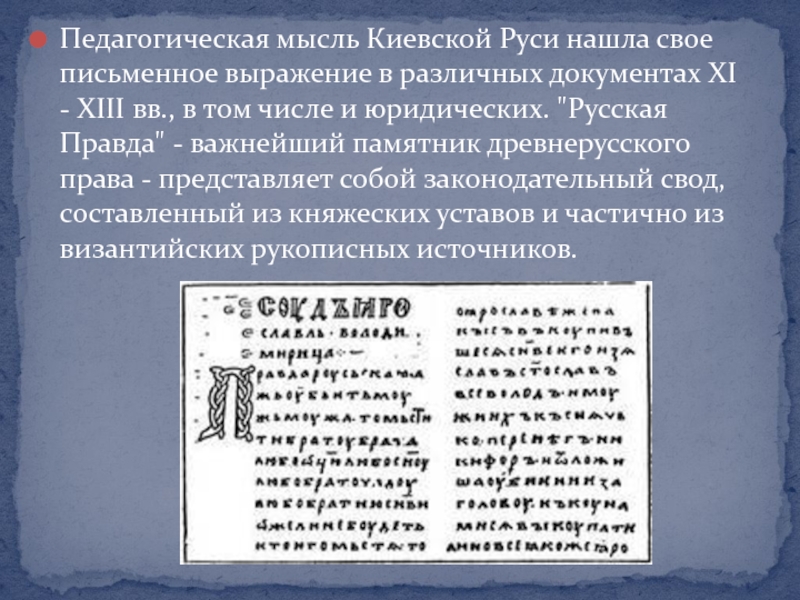 Слайд 20Педагогическая мысль Киевской Руси нашла свое письменное выражение в различных