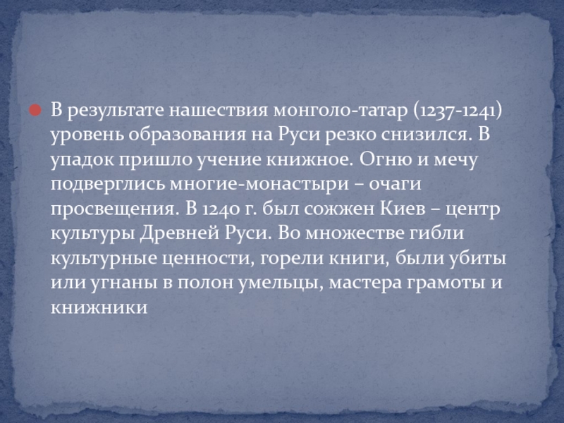 многие-монастыри – очаги просвещения. В 1240 г. был сожжен Киев – центр культуры Древней Руси. Во множестве гибли культурные ценности, горели книги, были убиты или угнаны в полон умельцы, мастера грамоты и книжники