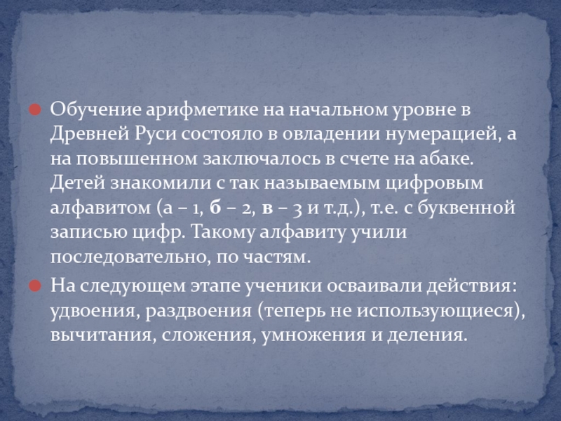Слайд 14Обучение арифметике на начальном уровне в Древней Руси состояло в