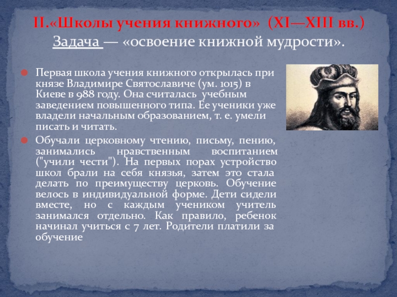 Слайд 9Первая школа учения книжного открылась при князе Владимире Святославиче (ум. 1015) в Киеве