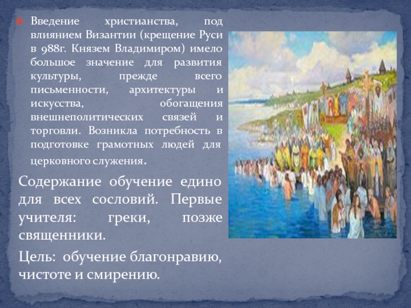 Слайд 4Введение христианства, под влиянием Византии (крещение Руси в 988г. Князем