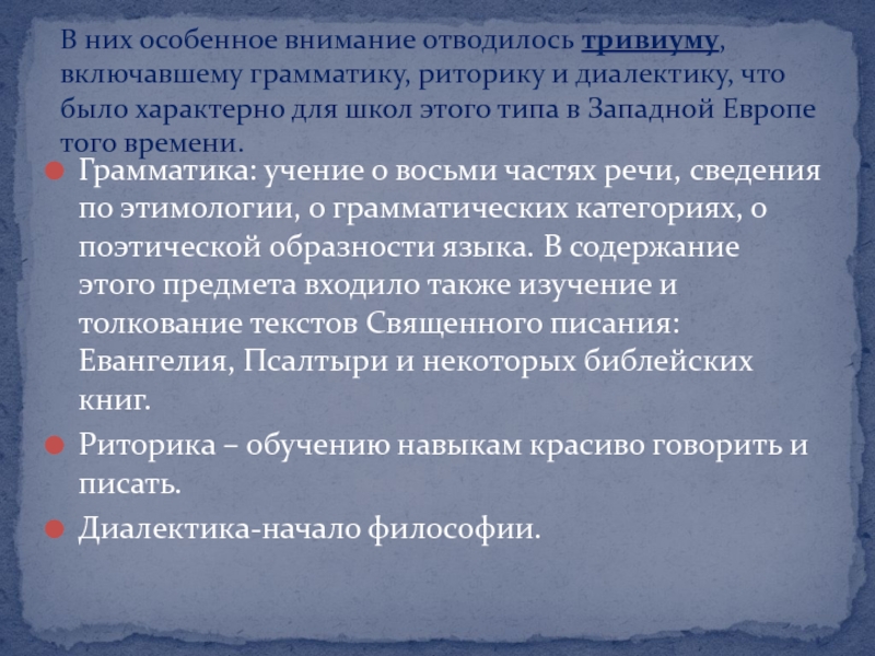 В них особенное внимание отводилось тривиуму, включавшему грамматику, риторику и диалектику, что было характерно для школ этого типа в Западной Европе того времени.