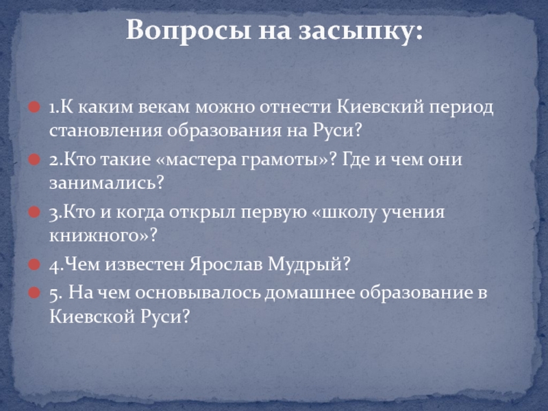 Слайд 251.К каким векам можно отнести Киевский период становления образования на