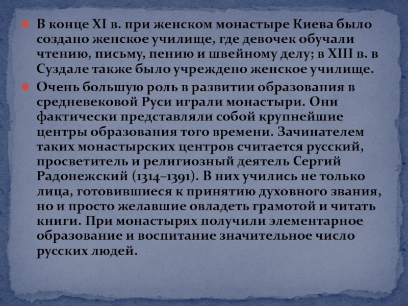 Очень большую роль в развитии образования в средневековой Руси играли монастыри. Они фактически представляли собой крупнейшие центры образования того времени. Зачинателем таких монастырских центров считается русский, просветитель и религиозный деятель Сергий Радонежский (1314–1391). В них учились не только лица, готовившиеся к принятию духовного звания, но и просто желавшие овладеть грамотой и читать книги. При монастырях получили элементарное образование и воспитание значительное число русских людей.