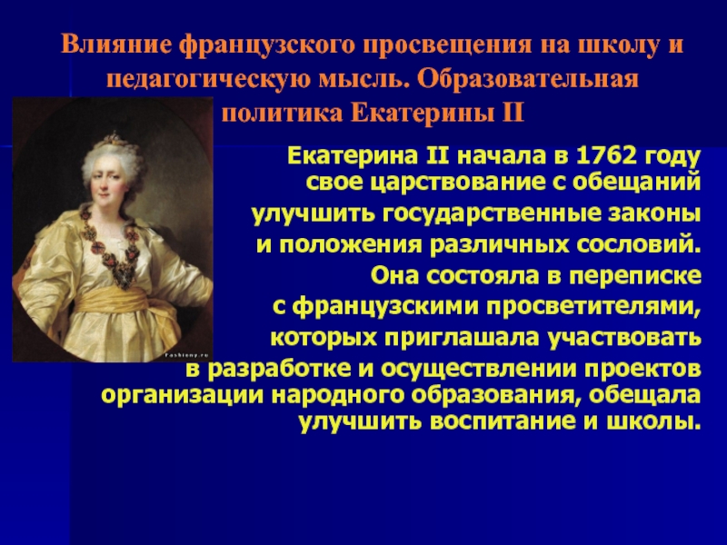 Влияние французского просвещения на школу и педагогическую мысль. Образовательная политика Екатерины П.