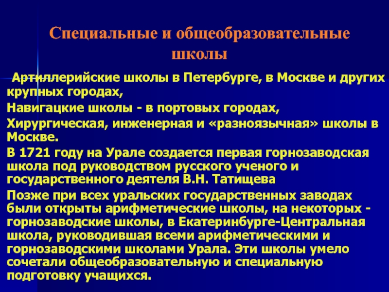 Позже при всех уральских государственных заводах были открыты арифметические школы, на некоторых - горнозаводские школы, в Екатеринбурге-Центральная школа, руководившая всеми арифметическими и горнозаводскими школами Урала. Эти школы умело сочетали общеобразовательную и специальную подготовку учащихся.