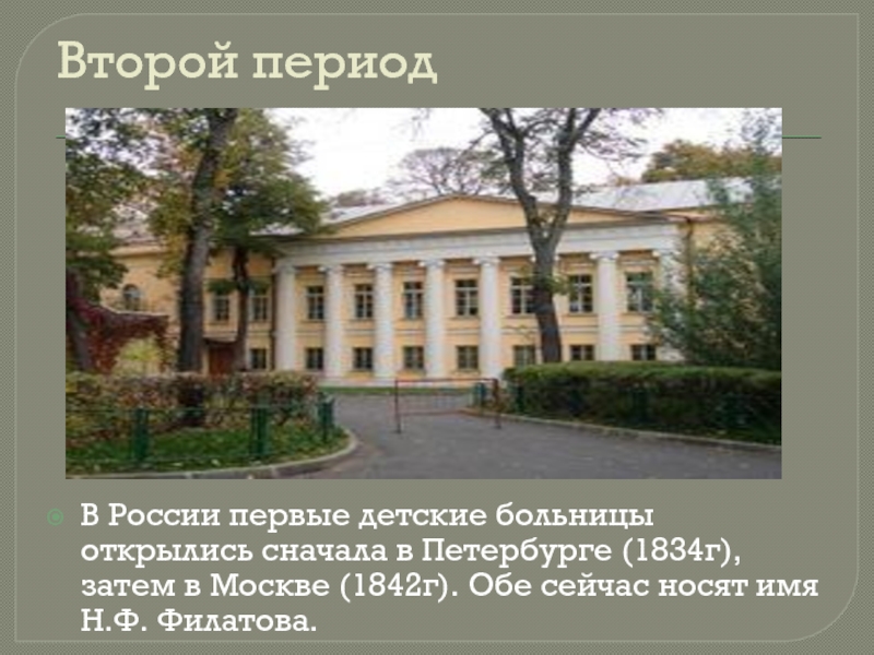 Слайд 4Второй период начинается с организации детских больниц и написания первых
