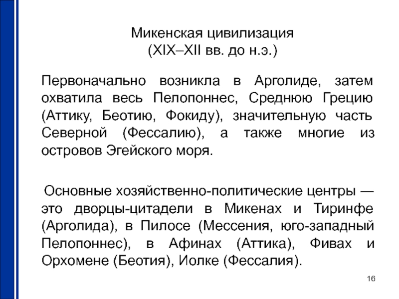 Слайд 16 Микенская цивилизация (XIX–XII вв. до н.э.)
