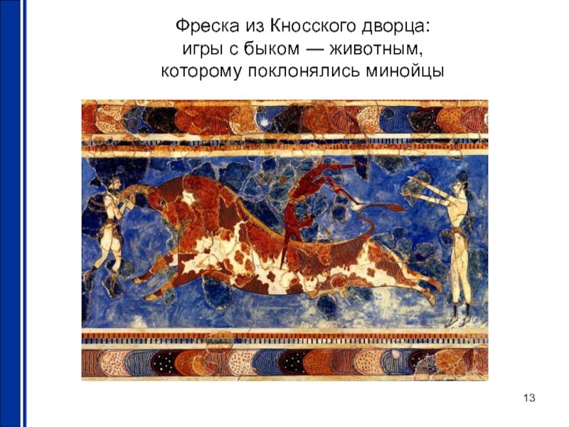 Слайд 13Фреска из Кносского дворца: игры с быком ― животным, которому поклонялись минойцы