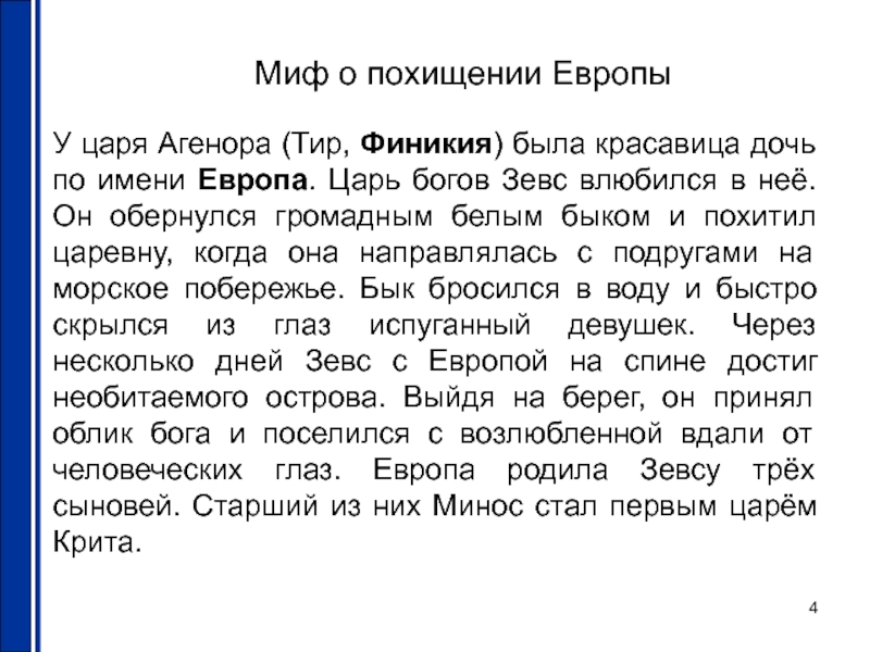 Миф о похищении ЕвропыУ царя Агенора (Тир, Финикия) была красавица дочь по имени Европа. Царь богов Зевс