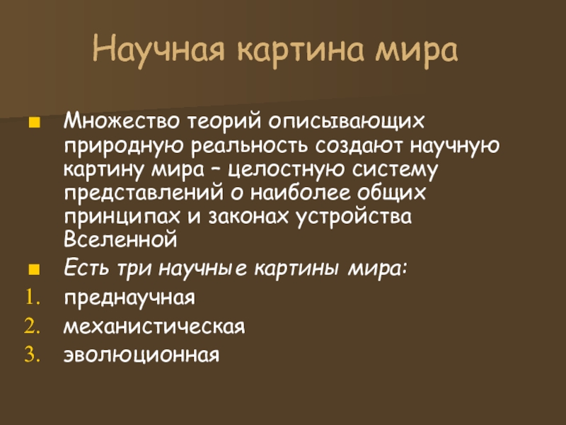 Мир – совокупность разноуровневых систем, находящихся в состоянии иерархической соподчиненности. На каждом уровне организации материи действуют свои закономерности
