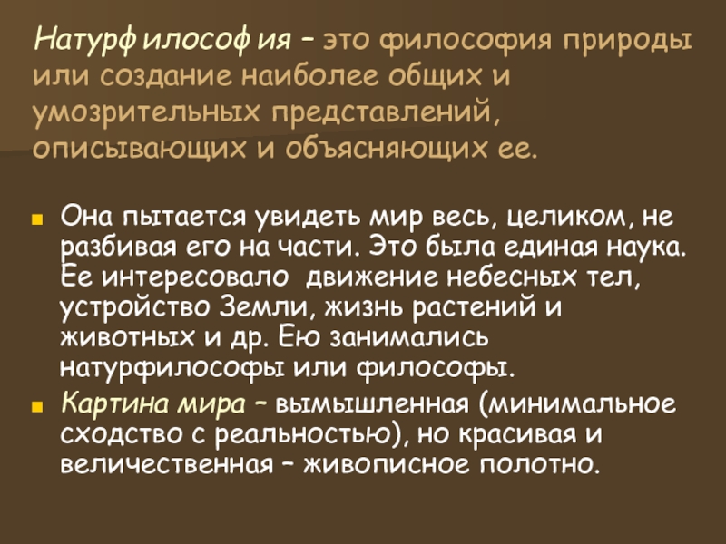 Натурфилософия – это философия природы или создание наиболее общих и умозрительных представлений, описывающих и объясняющих ее.