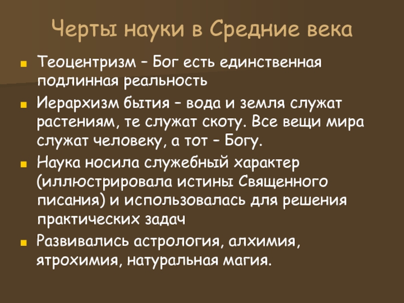 Наука носила служебный характер (иллюстрировала истины Священного писания) и использовалась для решения практических задач