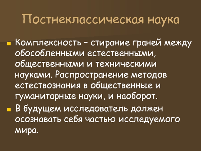 Наука должна осознать невозможность построения полной научной картины мира, она должна будет включить элементы субъективности в объективное знание или пустить в эту картину мира человека.