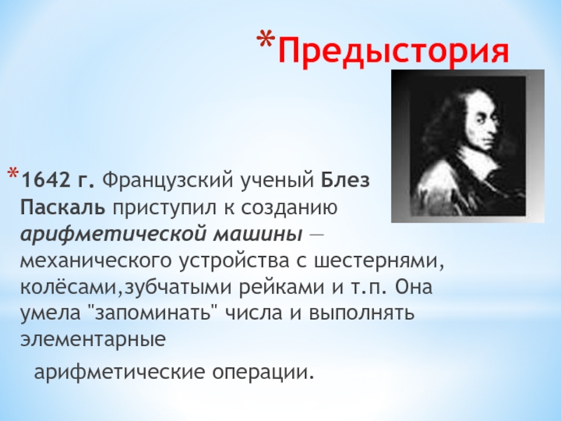1642 г. Французский ученый Блез Паскаль приступил к созданию арифметической
