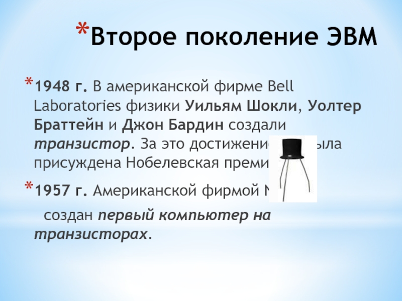 Уильям Шокли, Уолтер Браттейн и Джон Бардин создали транзистор. За