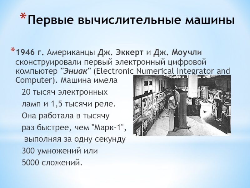 1946 г. Американцы Дж. Эккерт и Дж. Моучли