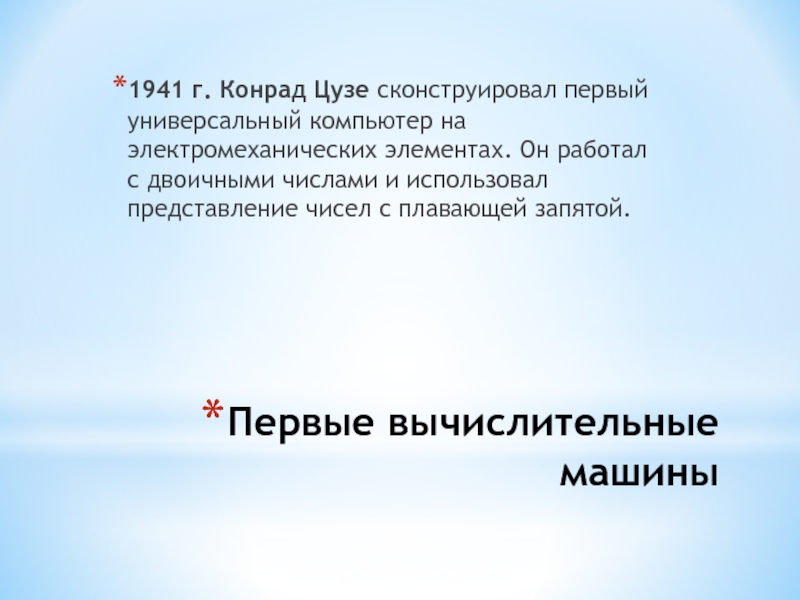 1941 г. Конрад Цузе сконструировал первый универсальный компьютер
