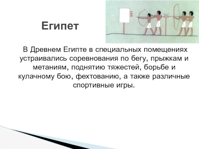 Слайд 11 В Древнем Египте в специальных помещениях устраивались соревнования по