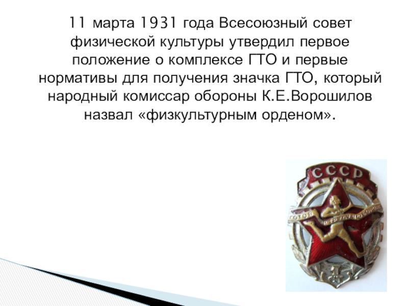 ГТО, который народный комиссар обороны К.Е.Ворошилов назвал «физкультурным орденом».