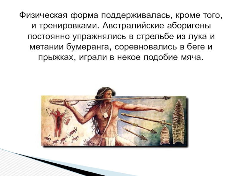 Слайд 3Физическая форма поддерживалась, кроме того, и тренировками. Австралийские аборигены постоянно