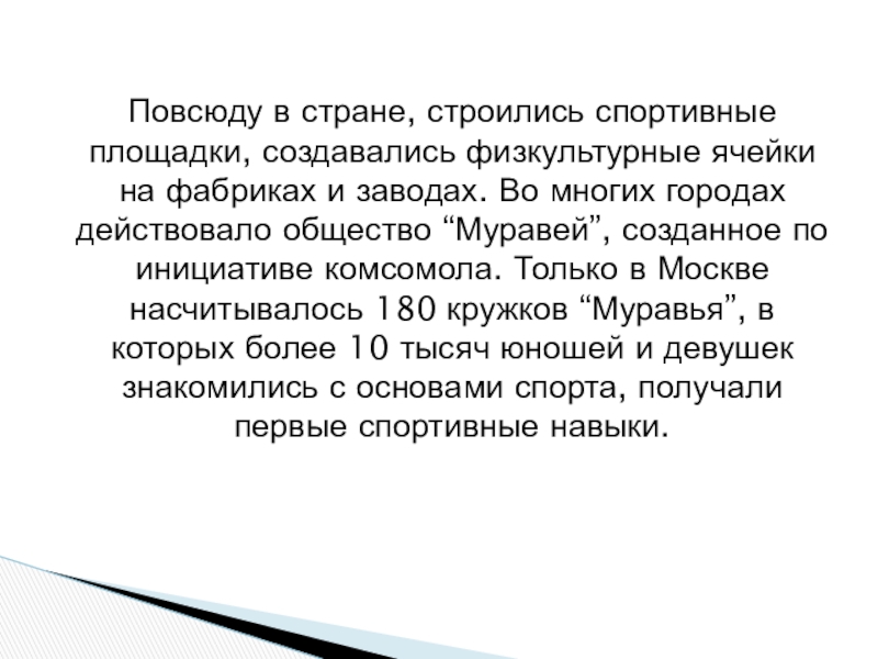 по инициативе комсомола. Только в Москве насчитывалось 180 кружков “Муравья”, в которых более 10 тысяч юношей и девушек знакомились с основами спорта, получали первые спортивные навыки.