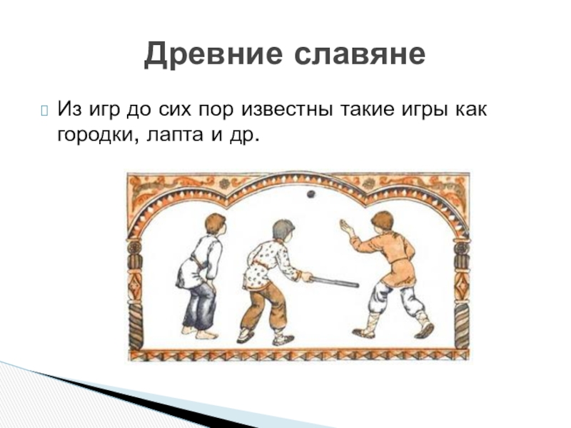 Слайд 20Из игр до сих пор известны такие игры как городки,