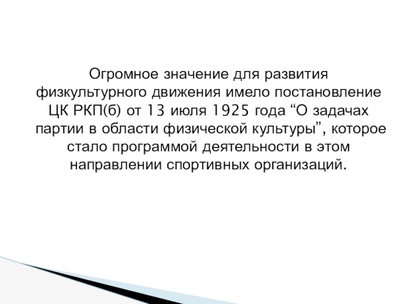 Слайд 31Огромное значение для развития физкультурного движения имело постановление ЦК РКП(б)