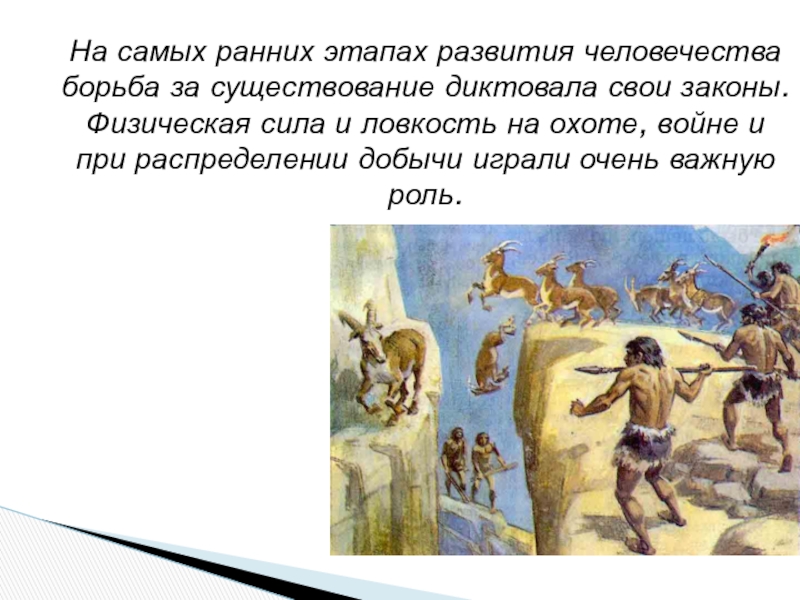 Слайд 2На самых ранних этапах развития человечества борьба за существование диктовала