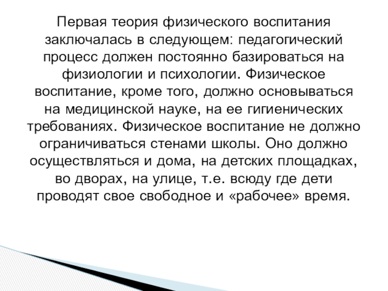 Слайд 27Первая теория физического воспитания заключалась в следующем: педагогический процесс должен