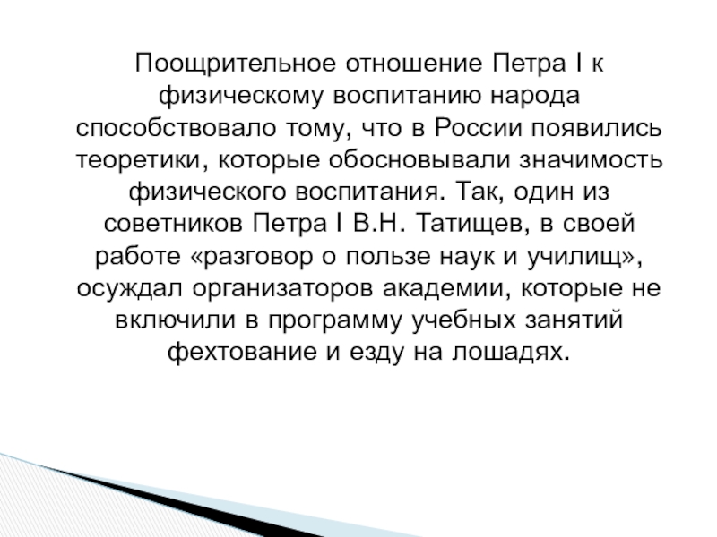 Слайд 22Поощрительное отношение Петра I к физическому воспитанию народа способствовало тому,