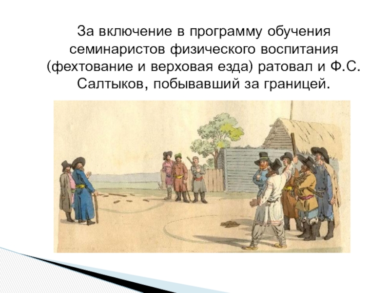 Слайд 24За включение в программу обучения семинаристов физического воспитания (фехтование и