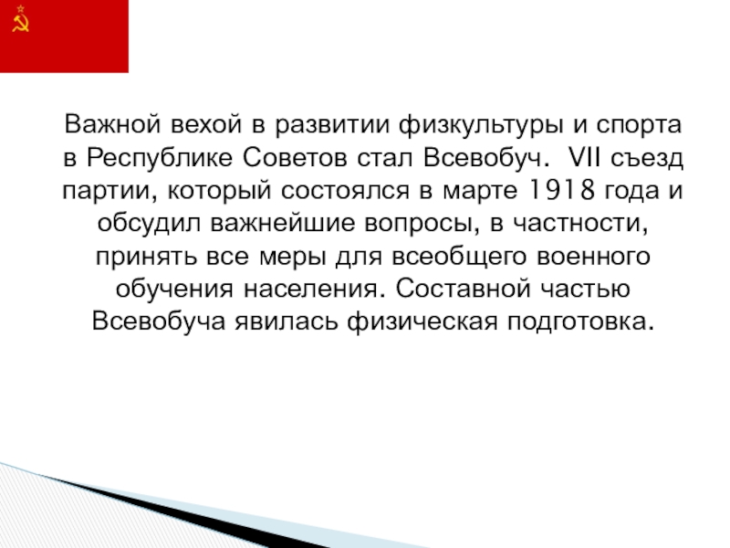 года и обсудил важнейшие вопросы, в частности, принять все меры для всеобщего военного обучения населения. Составной частью Всевобуча явилась физическая подготовка.