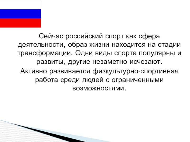 Слайд 35Сейчас российский спорт как сфера деятельности, образ жизни находится на