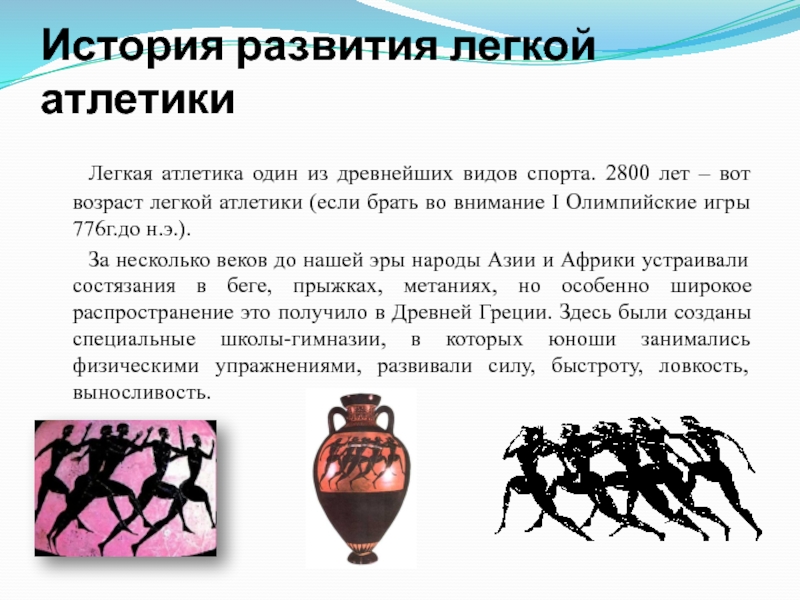 За несколько веков до нашей эры народы Азии и Африки устраивали состязания в беге, прыжках, метаниях, но особенно широкое распространение это получило в Древней Греции. Здесь были созданы специальные школы-гимназии, в которых юноши занимались физическими упражнениями, развивали силу, быстроту, ловкость, выносливость.