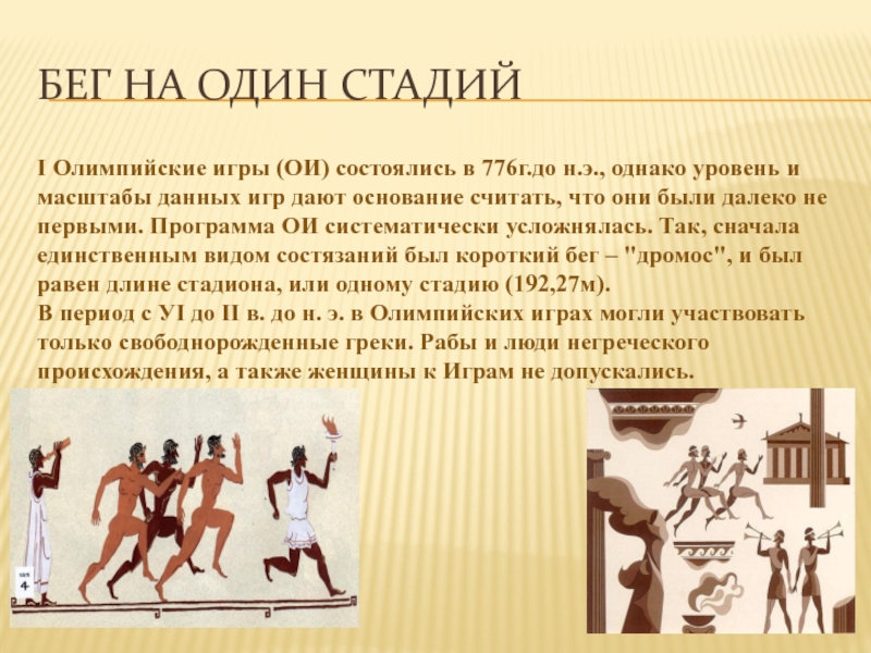 что они были далеко не первыми. Программа ОИ систематически усложнялась. Так, сначала единственным видом состязаний был короткий бег – "дромос", и был равен длине стадиона, или одному стадию (192,27м).