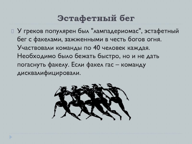 каждая. Необходимо было бежать быстро, но и не дать погаснуть факелу. Если факел гас – команду дисквалифицировали.