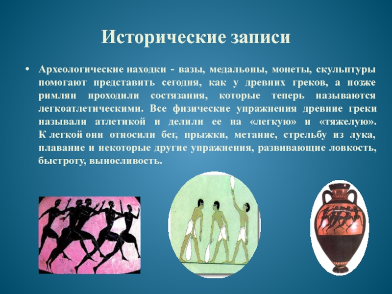 теперь называются легкоатлетическими. Все физические упражнения древние греки называли атлетикой и делили ее на «легкую» и «тяжелую». К легкой они относили бег, прыжки, метание, стрельбу из лука, плавание и некоторые другие упражнения, развивающие ловкость, быстроту, выносливость.